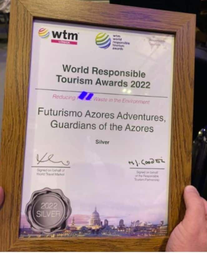 Das Bürgerwissenschaftsprojekt "Guardians of the Azores" erhielt den Silbernen Preis in der Kategorie "Verringerung von Plastikmüll in der Umwelt" auf dem 2022 WTM-Preise für verantwortungsvollen Tourismus. Futurismo setzte sich gegen zahlreiche globale Konkurrenten durch und war stolz darauf, einer der 21 Finalisten zu sein.